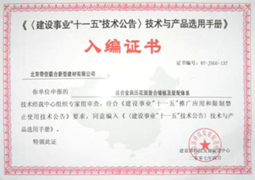 - 2007年被選入《建設(shè)業(yè)“十一五” 技術(shù)公告技術(shù)與產(chǎn)品選用手冊》